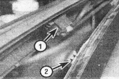 8.4. Отделите от кузова (2) фиксатор обтекателя ветрового стекла (1).