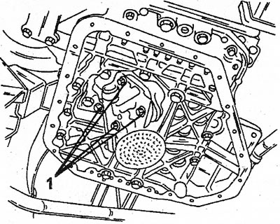 8. В случае если установлена упорная пластина, проведите выше описанные работы, до снятия масляного поддона с блока цилиндров. Масляный насос находится на показанном месте (см. иллюстрацию). Отверните четыре болта (1) сетки маслоприемника и снимите крышку насоса. Выньте роторы из корпуса насоса. Снимите два оставшиеся болта и вытащите масляный насос. Тщательно очистите поверхность масляного поддона и картера коленвала.