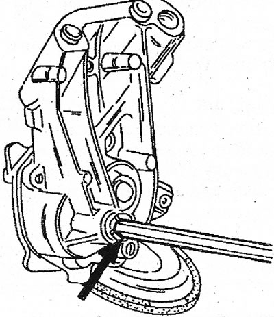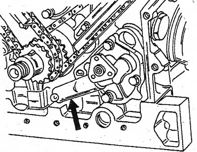 24. Снимите крышку насоса (см. иллюстрацию) и насос с блока цилиндров. Не бейте киянкой по детали, указанной стрелкой.