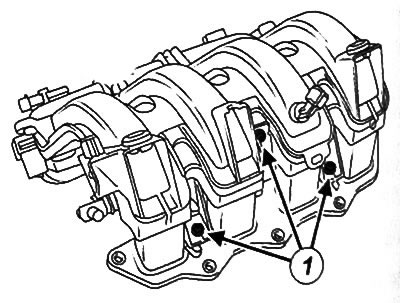 5. Отвернуть болты (1) и снять топливную рампу в сборе.