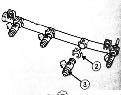 7. Удалить зажимы (2) и снять топливные форсунки (3).