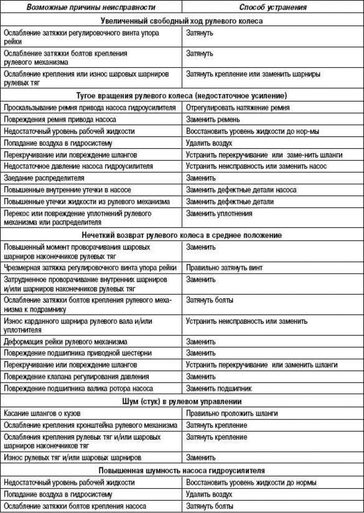 Таблица 5.2. Возможные неисправности, их причины и способы устранения (рулевое управление с гидроусилителем)