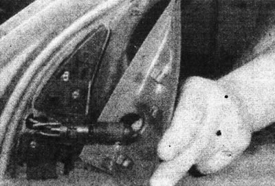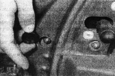6. Адкруціце тры крапежныя гайкі люстэркі і зніміце люстэрка з дзвярэй. На мадэлях з механічнымі люстэркамі выдаліце люстэрка, прапусціўшы тросік рэгулятара і рычаг праз праём у дзверы (гл. ілюстрацыю).