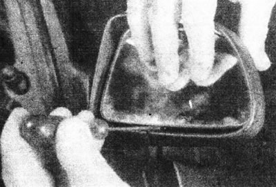 9. Выкарыстоўваючы тонкую адвёртку, акуратна знайдзіце пад краем шкла люстэркі канцы драцянога фіксатара, які мацуе шкло.