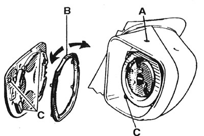 18.15. Кампаненты знешняга люстэрка (шкло мацуецца блакавальным кольцам): А - Адтуліна доступу (ніжні бок кажуха); У - Зубчастая частка блакавальнага кольца; З - Накіроўвалыя шкла.
