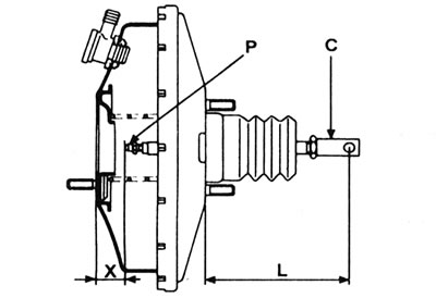 3.9. Рэгуляванне даўжыні штурхача ўзмацняльніка: З - Відэлец штангі-штурхача; L - 110 мм; Р - Гайка штангі-штурхача; X - 22.3 мм.