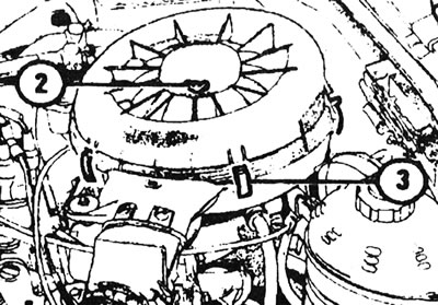 21.1 Зніміце вечка паветранага фільтра -рухавік З-серыі: 2 - Гайка-баранчык; 3 - Спружынная клямар.