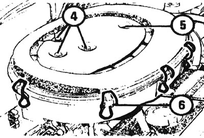21.2 Зніміце вечка паветранага фільтра рухавік Е-серыі: 4 - Шрубы; 5 - Вінт; 6 - Спружынная клямар.