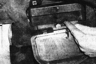 5. Працуючы ў пярэднім левым куце маторнага адсека, адкруціце два шрубы мацавання і апусціце вечка паветранага фільтра (гл. ілюстрацыю).