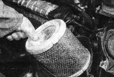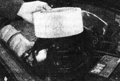 1. Вызваліце спружынныя клямкі, і зніміце гайку-баранчык з вечка паветранага фільтра (гл. ілюстрацыю).