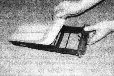 6. Павярніце крапежны клямар на 90°, затым адкіньце пляцоўку паветранага фільтра ўніз, і дастаньце фільтр з-пад аўтамабіля (гл. ілюстрацыі).