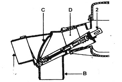 25.3а Сістэма рэгулявання тэмпературы паветра -рухавікі З- і Е-серый: А - Халоднае ўваходнае паветра; У - Гарачае ўваходнае паветра; З - Засланка кіравання; D - Да карбюратара; 2 - Тэрмастат.
