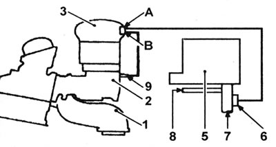 25.3b Сістэма рэгулявання тэмпературы паветра - рухавік F3Р:А - Да вакуумнай капсулы; У - Ад впускного калектара; 1 - Выпускны калектар; 2 - Впускны калектар; 3 - Вечка паветразаборніка; 5 - Паветраны фільтр; 6 - Тэрмастат/вакуумная капсула; 7 - Халоднае ўваходнае паветра; 8 - Гарачае ўваходнае паветра; 9 - Злучэнне вакууму калектара.