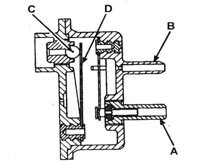 25.5 Схема термоуправляемого вакуумнага клапана: А - Да вакуумнай капсулы; У - Ад впускнога калектара; З - Шарык клапана; D - Біметалічная пласціна.