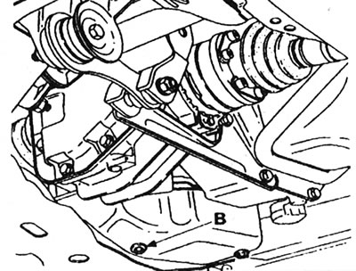 9. Працуючы пад аўтамабілем, адкруціце (але не здымайце) задні ніт, які мацуе задняе падвешванне рухавіка да дна. Адкруціце і зніміце пярэдні ніт, і адвядзіце падвешванне ўніз.