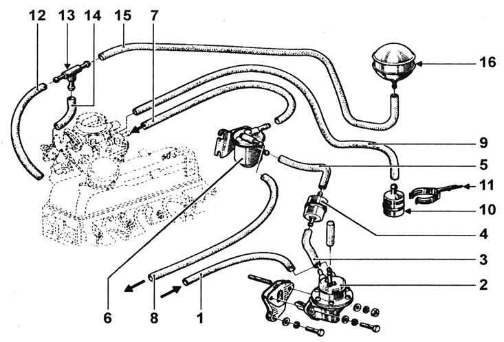 7.5. Топливоподкачивающий помпа і злучаныя кампаненты:1 - Паліўны впускной шланг; 2 - Топливоподкачивающий помпа; 3 - Паліўны выпускны шланг; 4 - Паліўны фільтр; 5 - Злучальны шланг; 6 - Аддзяляльнік пара; 7 - Впускны шланг карбюратара; 8 - Зваротны паліўны шланг; 9 - Вентыляцыйны шланг; 10 - Бачок назапашвання пара; 11 - Хамут; 12 - Вакуумны шланг (ад калектара); 13 - Т-вобразны злучальнік; 14 - Вакуумны шланг (да вакуумнай капсулы засланкі); 15 - Вакуумны шланг (да рэзервуара); 16 - Вакуумны рэзервуар.