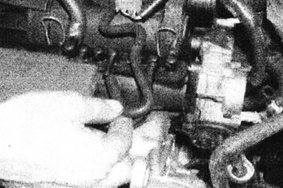 4. Дзе ўжываецца, прыслабце хамуты і адлучыце впускной паветравод ад паветранага фільтра і трубы паветразаборніка, затым адкруціце шрубу мацавання ўпускнога паветравода, адлучыце шлангі сапуна ад паветравода, і зніміце паветравод. Сапраўды гэтак жа зніміце паветравод, які злучае паветраны фільтр з впускным калектарам (гл. ілюстрацыі).