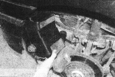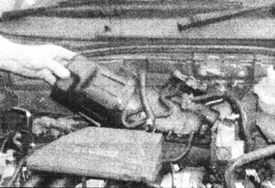 17. Працуючы ў маторным адсеку, адкруціце шрубы і гайку, якія мацуюць трубу, якая злучае паветраны фільтр з корпусам дроселя, затым адлучыце канец трубы ад паветранага фільтра і перамесціце яе ў бок (гл. ілюстрацыю).