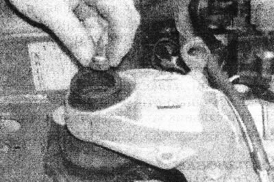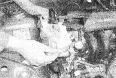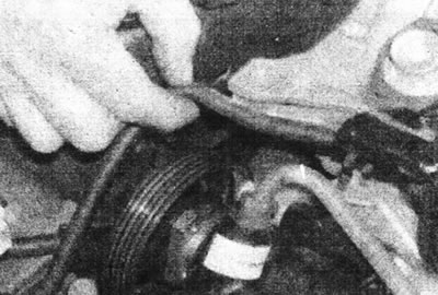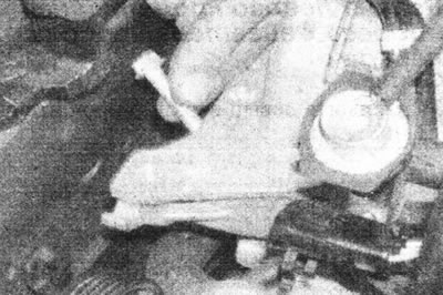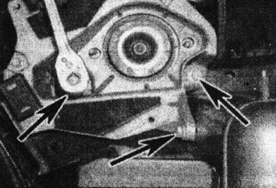 4. Адкруціце гайку, якая мацуе кранштэйн да гумы падвеса рухавіка, і дастаньце гумовую падушку, затым адкруціце тры ніта, якія мацуюць кранштэйн да ніжняга кранштэйна падвеса рухавіка/вечку зубчастага прываднага рамяня, і дастаньце кранштэйн (гл. ілюстрацыі).
