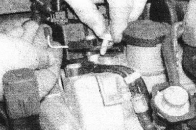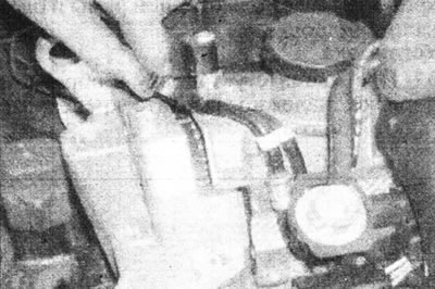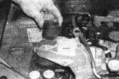 13. Акуратна зніміце клямку, якая мацуе паліўныя шлангі да задняй часткі кранштэйна ніжняга падвешвання рухавіка/вечкі зубчастага рамяня, затым вызваліце шлангі ад верхняга кранштэйна/крышкі (гл. ілюстрацыі).