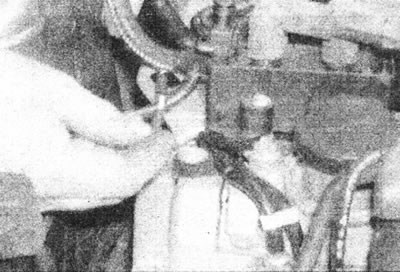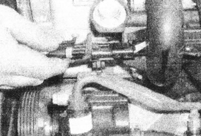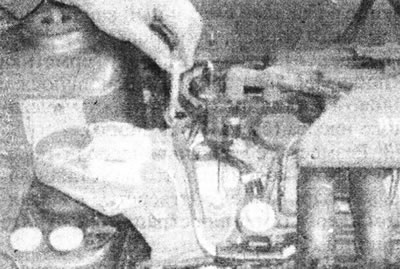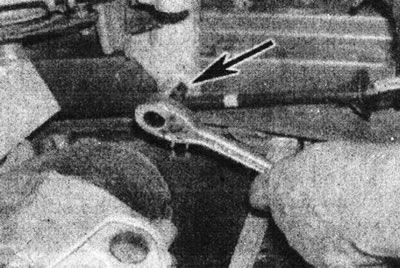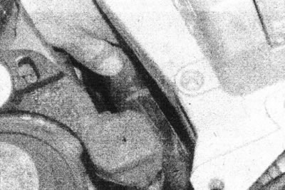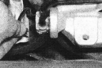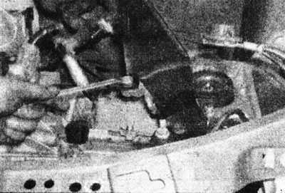 35. Працуючы пад аўтамабілем, адкруціце балты (заблакуйце гайкі другім гаечным ключом), якія мацуюць апорны відэлец задняга падвешвання да кранштэйнаў на падматорнай раме і блоку цыліндраў, заўважце месцазнаходжанне шайбаў і распорных пракладак на нітах. Дастаньце вузел з-пад аўтамабіля.