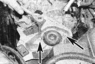 14. Адкруціце чатыры ніта, якія мацуюць кранштэйн ніжняга падвешвання рухавіка/вечка зубчастага рамяня да галоўкі блока цыліндраў, затым выведзіце кранштэйн/вечка міма шланга сістэмы астуджэння, і дастаньце зборку з маторнага адсека (гл. ілюстрацыі).
