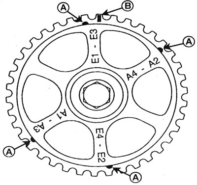 4.5. Першая з пазнак рэгулявання зазору клапанаў (А), пазначаная "Е1-Е3" на зорачцы распредвала, павінна сумясціцца з пазнакай (У) на затамкавым вечку (часова ўсталюеце вечка).