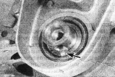 11.3. Выдаліце шпонку (адзначана стрэлкай) з пярэдняга канца коленвала. На позніх мадэлях яна з'яўляецца часткай зорачкі.