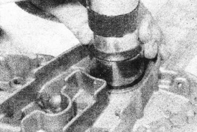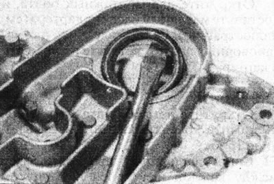 21. Сальнік са боку прываднага рамяня варта змяняць кожны раз пры выдаленні кажуха. Заўважце правільнае размяшчэнне старога сальніка, затым выміце яго адвёрткай і абатрыце апорную паверхню. Вышмаруйце вонкавы край новага сальніка і размесціце яго на кажусе, зачыненым бокам вонкі. Змесціце кажух на драўляным бруску, затым гняздом ці металічнай трубой забіце сальнік на месца (гл. ілюстрацыі).