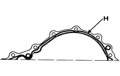 22. Ачысціце сумяшчальныя паверхні кажуха сальніка і блока цыліндраў ад герметыка. Вырабіце палоску герметыка дыяметрам 0.6-1.0 мм на кажух, затым усталюеце яго на блоку цыліндраў, і надзейна зацісніце ніты. Герметык павінен праходзіць вакол унутраных граняў адтулін пад балты (гл. ілюстрацыю).