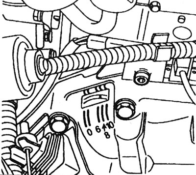 10. Калі поршань №1 усталяваны ў становішча ВМТ, усталявальная пазнака на зорачцы распредвала павінна быць сумешчаная з пазнакай на канцы затамкавага вечка (гл. ілюстрацыю 5.10).