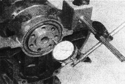 Падштурхніце коленвал цалкам у адзін бок, а затым усталюеце мікраметр на нуль. Высуньце коленвал цалкам у іншы бок і праверце восевы зазор. Вынік можна параўнаць з паказаным у Спецыфікацыях і вызначыць, ці патрабуюцца новыя ўпартыя шайбы.