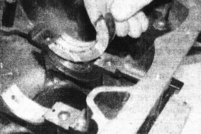 7. Зніміце ўпартыя шайбы з кожнага боку цэнтральнага карэннага падшыпніка (рухавікі С- і Е-серый) ці карэнны падшыпнік №2 (рухавік F-серыі), затым выдаліце верхнія паловы ўкладышаў з картара. На рухавіках D-серыі, упартыя шайбы ўмантаваны ў цэнтральны верхні карэнны ўкладыш, які не мае ніякага ўсталявальнага выступу, таму яго можна ўсталёўваць у любым становішчы - запомніце арыентоўку ўкладыша/упартай шайбы, калі яны не будуць мяняцца (гл. ілюстрацыі).