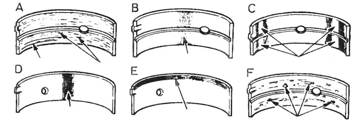 17.2. Тыповыя пашкоджанні ўкладышаў: А - Падрапаны іншароднымі часціцамі - бачныя макулінкі, якія пагрузіліся ў працоўны пласт укладыша; У - Недахоп алею - верхні пласт сцёрты; З - Укладышы няправільна размешчаны пры ўсталёўцы - маюцца бліскучыя (адпаліраваныя) участкі; D - Шыйка зведзена на конус - верхні пласт зняты з усёй паверхні; Е - Знос краю ўкладыша; F - Няспраўнасць "стомленасці" - утварыліся кратары або кішэні.