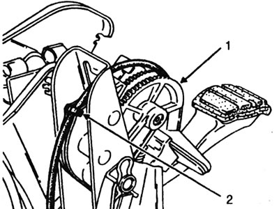 2.4b. Месцазнаходжанне тросіка на зубчастым сегменце рэгулятар: 1 - Зубчасты сегмент; 2 - Накіроўвалая.