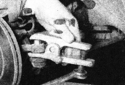 3. Адкруціце два ніта, якія мацуюць зборку суппорта тормазу да паваротнага кулака, і зніміце зборку суппорта з дыска. Кавалкам дроту або шпагату падвяжыце суппорт да спружыны перадпакоя падвескі так, каб не нацягнуць тармазны шланг.