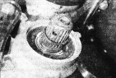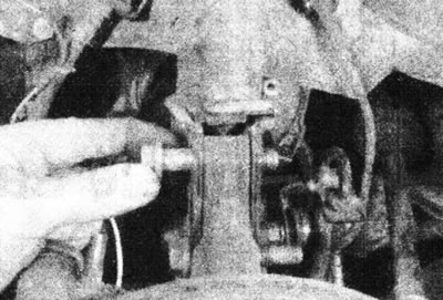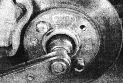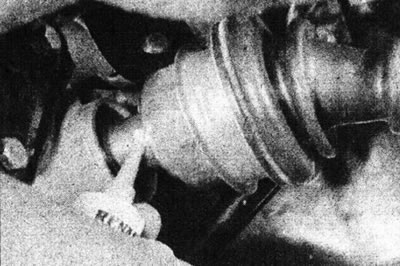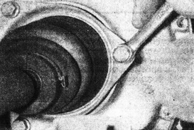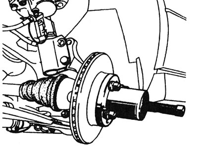 9. Зніміце ніжні ніт, які мацуе паваротны кулак да стойкі падвескі. Сочачы за тым, каб не пашкодзіць ахоўныя чахлы прываднага вала, выпусціце вонкавы Шрус са калодкі і зніміце прывадны вал. Звернеце ўвагу, што на пазы вонкавага Шруса нанесены блакавальны склад, каб выцесніць Шрус са калодкі выкарыстоўвайце малаток і выбівачку, выкананую з мяккага металу, ці ж здымнік (гл. ілюстрацыю).