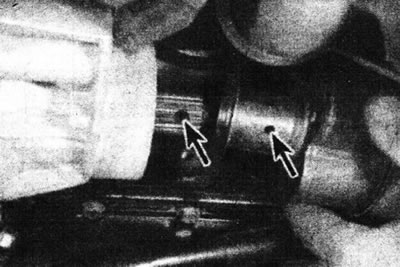 10. Павярніце прывадны вал так, каб сталі бачныя цыліндрычныя штыфты, якія мацуюць унутраны Шрус да вала паўвосевай шасцярні дыферэнцыяла. Выцесніце штыфты з дапамогай малатка і мысліка дыяметрам 5 мм (гл. ілюстрацыю).
