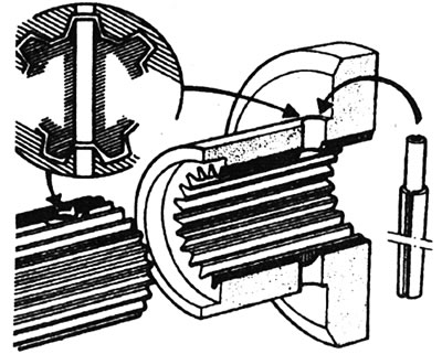 29. Сумясціце пазы прываднага вала з пазамі вала паўвосевай шасцярні, выраўнаваўшы адтуліны пад цыліндрычныя штыфты (гл. ілюстрацыю).