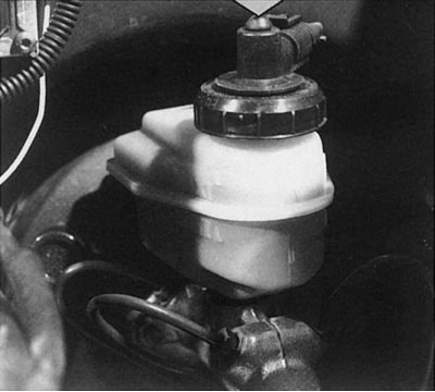 Узровень тармазной вадкасці не павінен апускацца ніжэй ніжняй пазнакі MINI. Для праверкі спраўнасці ўсталяванага ў вечку бачка кантрольнага выключальніка, Вы павінны націснуць на гумовую крышку (паказана стрэлкай). Пры націску на яе на прыборнай панэлі павінна загарэцца кантрольная лямпа. Пры правядзенні гэтай праверкі павінен быць адключаны стаяначны тормаз. Пры падазрэнні на няспраўнасць праверце кантактны раз'ём.