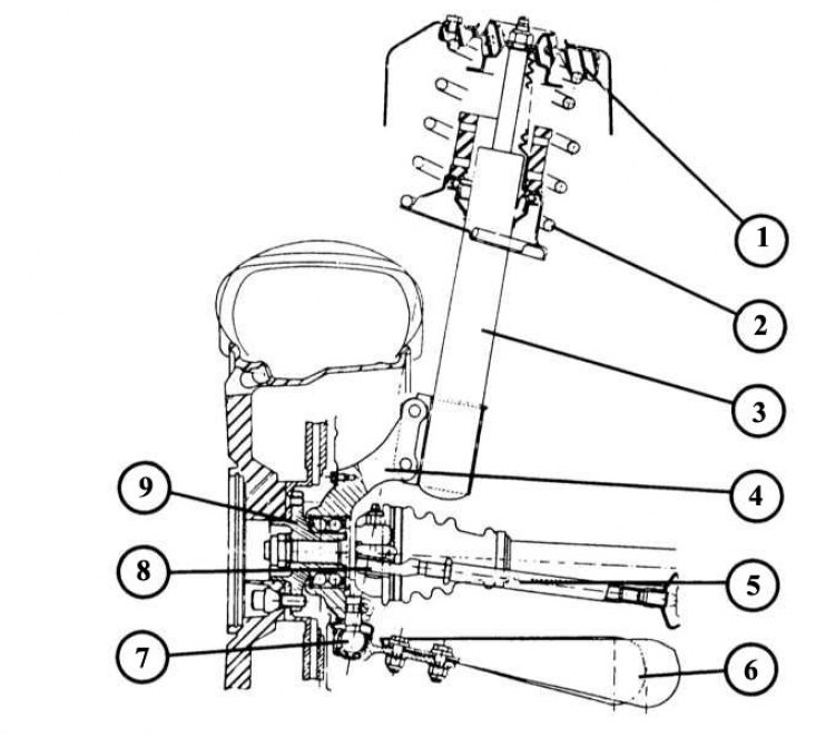1 - верхняе мацаванне стойкі амартызатара; 2 - шрубавая спружына; 3 - стойка амартызатара ў зборы; 4 - рулявая паваротная апора; 5 - цяга рулявой трапецыі з ушчыльняльнай абшэўкай; 6 - папярочны рычаг незалежнай падвескі; 7 - шаравой шарнір папярочнага рычага; 8 - наканечнік папярочнай рулявой цягі; 9 - ступица кола.