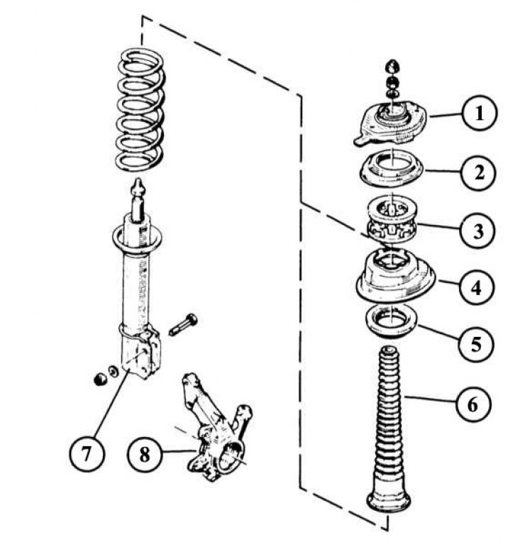 1 - нацяжная пліта; 2 - верхняя апора спружыны; 3 - абмежавальнік ходу спружыны; 4 - ніжняя апора спружыны; 5 - апора на паваротнай цапфе; 6 - пылаахоўная абшэўка; 7 - стойка амартызатара ў зборы; 8 - рулявая паваротная апора. Для палягчэння зборкі неабходна пазначаць месца ўстаноўкі.