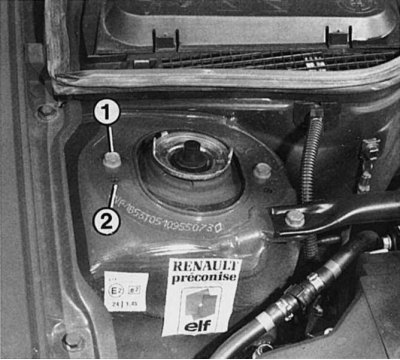 Для гэтага патрабуецца нацяжная прынада (інструмент Renault Sus.1052) ці, як мінімум, 2 стандартных стяжных прыстасаванні для шрубавай спружыны. Без іх існуе небяспека, што моцна сцягнутая шрубавая спружына пасля паслаблення цэнтральнага крапежнага ніта рэзка выскачыць са свайго мацавання. Будзьце асцярожныя, вельмі высокая верагоднасць траўмы!