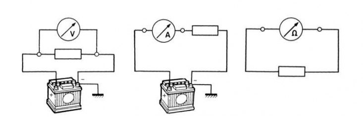 Малюнкі схематычна малююць (злева направа), як трэба падлучаць які адпавядае вымяральны прыбор для вымярэння напругі (У), сілы току (A) і супрацівы (Ом). Гурток са стрэлкай адлюстроўвае вымяральны прыбор, а "спажывец" уяўляе сабой, напрыклад, лямпу, электрарухавік і г.д.