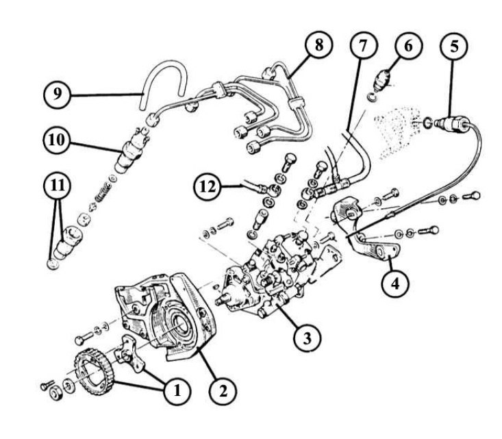 1 - зубчастае кола прывада; 2 - пярэдні кранштэйны ТНВД; 3 - прылада пуску халоднага рухавіка; 4 - задні кранштэйны ТНВД; 5 - тэрмаэлемент "хуткага" халастога ходу; 6 - прылада адключэння саленоіднага кіравання; 7 - адвод паліва; 8 - трубаправоды высокага ціску да фарсунак; 9 - злучальны трубаправод паміж фарсункамі; 10 - фарсунка са складовымі элементамі; 11 - корпус фарсункі з тэрмічнай абаронай; 12 - адвод паліва.