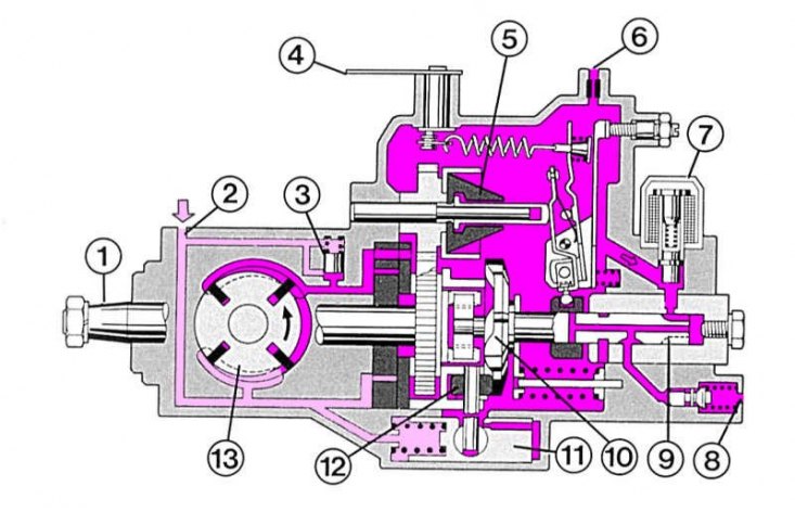 1 - прывадны вал; 2 - падача паліва; 3 - рэдукцыйны клапан помпы; 4 - рычаг цягі акселератара; 5 - цэнтрабежны рэгулятар; 6 - адводная адтуліна; 7 - прылада адключэння саленоіднага кіравання; 8 - паліўны трубаправод да фарсунак; 9 - размеркавальны плунжар; 10 - кулачковы дыск; 11 - муфта апярэджання ўпырску паліва (тут для лепшага разгляду звернутая на 90°; 12 - ролікавае кольца; 13 - лопасцевай топливоподкачивающий помпа (таксама звернуты на 90°).