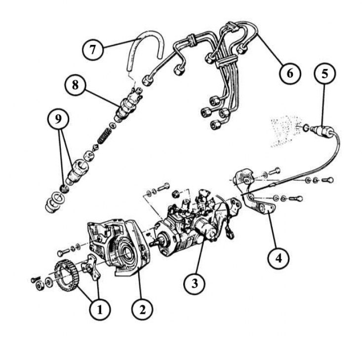 1 - зубчастае кола прываднага рамяня; 2 - пярэдні кранштэйны паліўнай помпы высокага ціску (ТНВД); 3 - электрамагнітная муфта апярэджання ўпырску паліва; 4 - задні кранштэйны ТНВД; 5 - тэрмаэлемент "хуткага" халастога ходу; 6 - трубаправоды высокага ціску да фарсунак; 7 - злучальны шланг паміж фарсункамі; 8 - фарсунка з састаўнымі часткамі; 9 - корпус фарсункі з тэрмічнай абаронай.