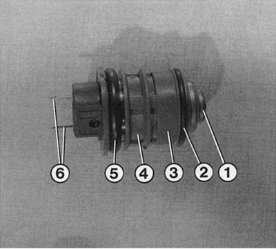 1 - сядло клапана; 2 - ніжняе ўшчыльняльнае кольца; 3 - абмотка фарсункі; 4 - кальцавая камера з паліўным фільтрам; 5 - верхняе ўшчыльняльнае кольца; 6 - 2-штырковый раз'ём.