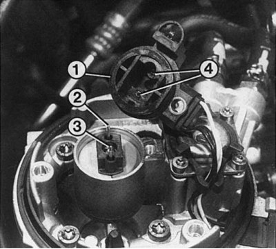 Для зняцця фарсункі, пасля таго як адкруціце ахоўны ніт, зніміце корпус фарсункі (1) з датчыкам тэмпературы якое ўсмоктваецца паветра. Асцярожна выміце фарсунку з мацавання. Пры ўсталёўцы не пераблытайце палярнасць кантактаў (3 ="–"; 2 ="+"). Вышмаруйце O-вобразнае кольца корпуса фарсункі вазелінам, каб штырковый раздым (4) быў абаронены ад акіслення.