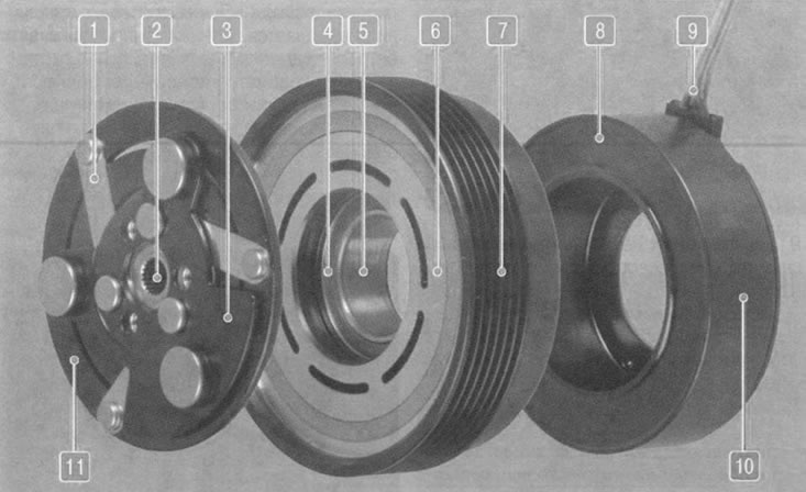 Мал. 12.5. Электрамагнітная муфта прывада кампрэсара: 1 - пругкі сталёвы ланцужок; 2 - шлицевое адтуліну ступіцах дыска; 3 - кіраваны дыск муфты; 4 - падшыпнік; 5 - унутраная абойма падшыпніка; 6 - працоўная паверхня шківа; 7 - ручаі шківа; 8 - абмотка электрамагніта; 9 - паляць правадоў электрамагніта; 10 - корпус электрамагніта; 11 - прыціскны дыск муфты